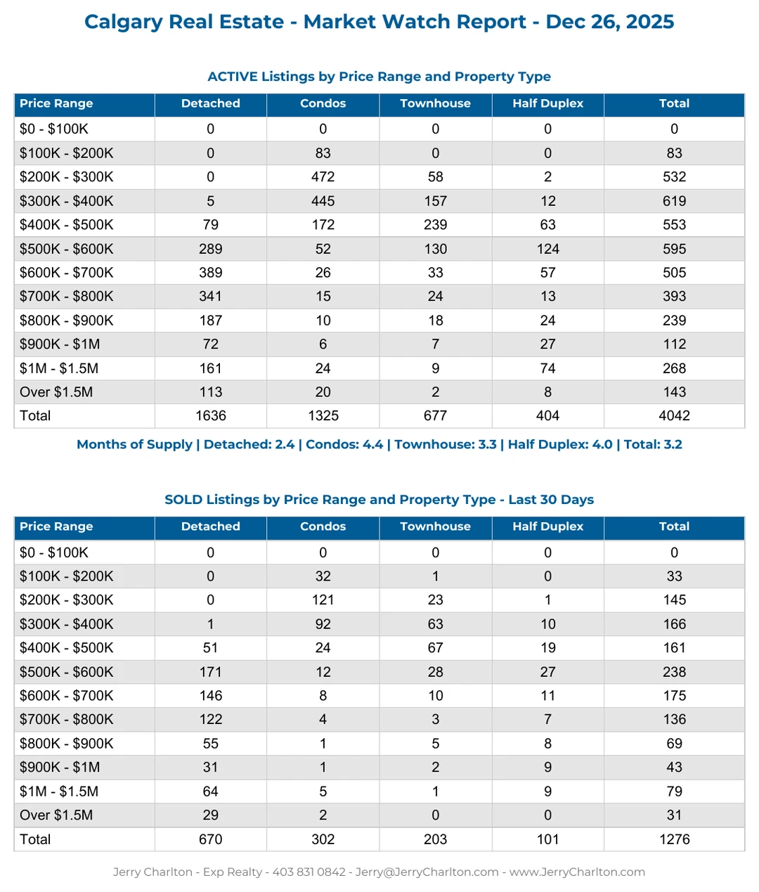 This week’s numbers show 4,042 active listings and 1,276 sales in the last 30 days, which puts the overall market at 3.2 months of supply. That’s still a seller-leaning environment, even at year-end.