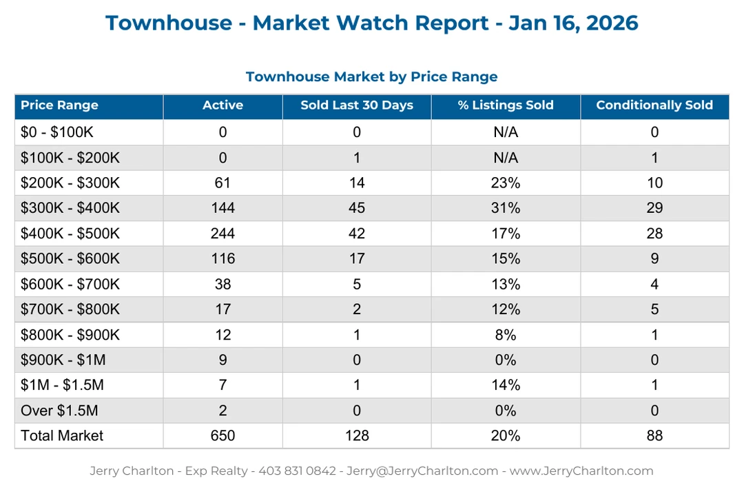Townhomes keep doing what they’ve been doing for years: quietly outperform expectations. With 650 active listings and 128 sales, the segment sits at a 20% absorption rate, solid for mid-January.