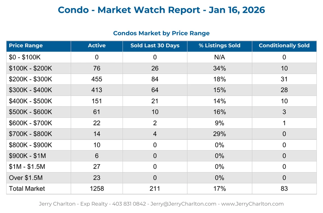 The condo market continues to offer buyers choice, leverage, and time. There are 1,258 active condo listings, with 211 sold in the past 30 days — a 17% absorption rate overall.