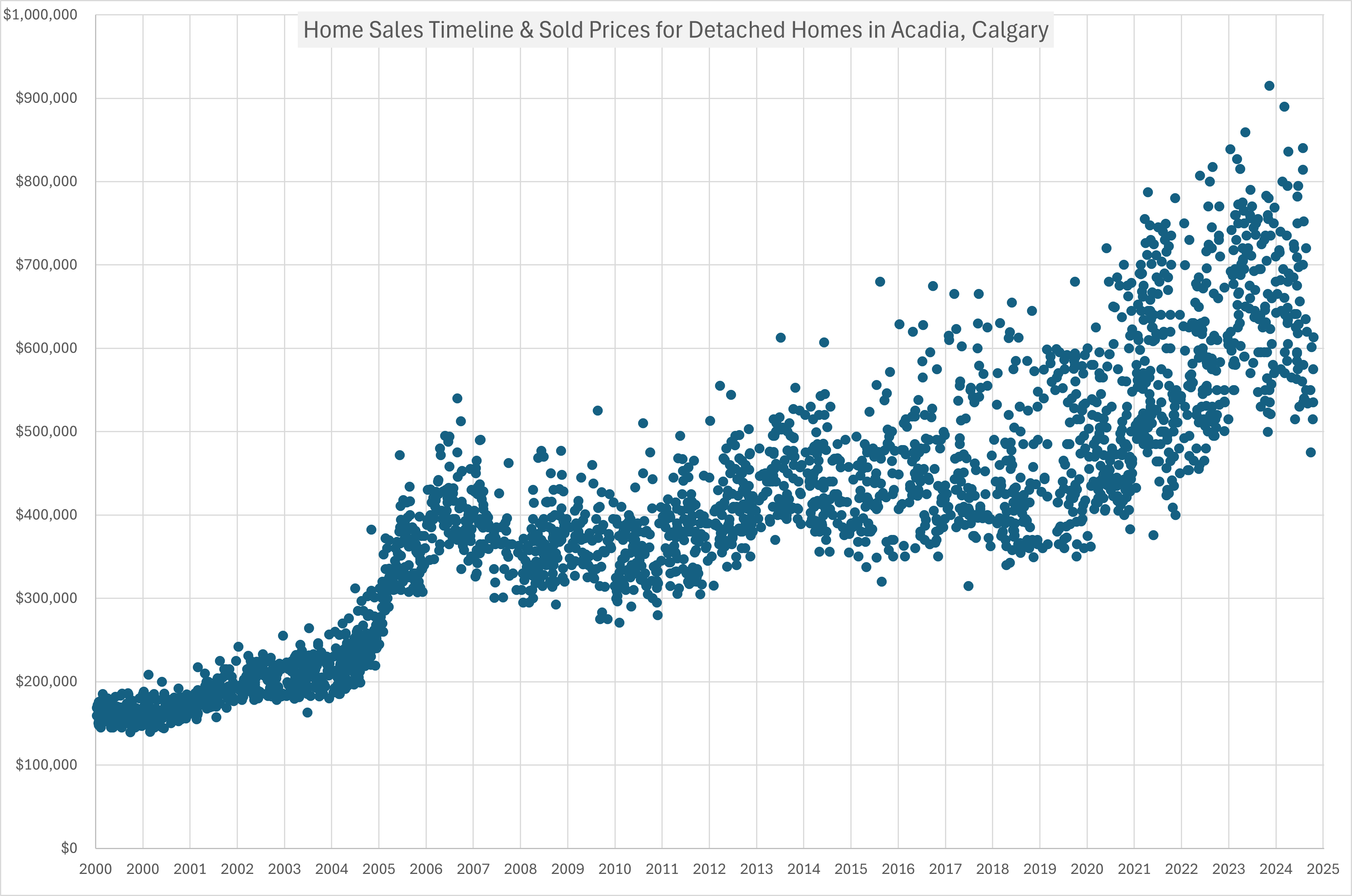 Every point on this chart represents a real detached home sale in Haysboro — decades of verified MLS® data showing how this community has weathered every market shift and continued to grow in value.